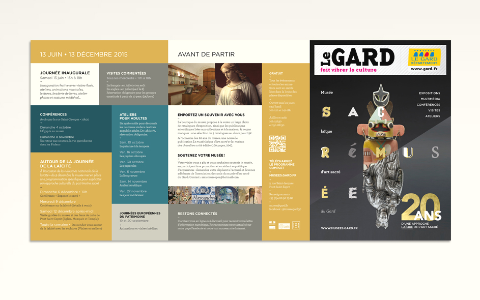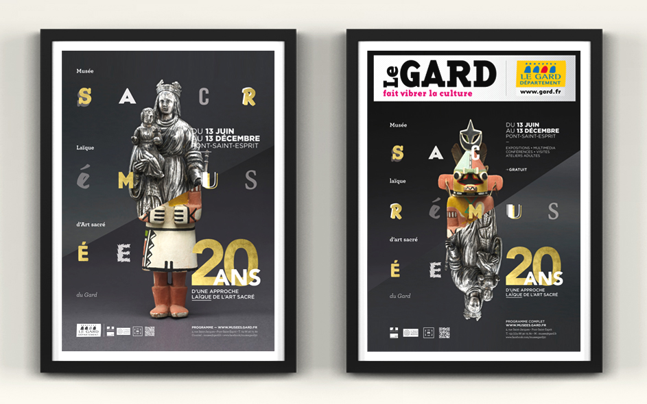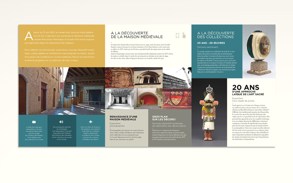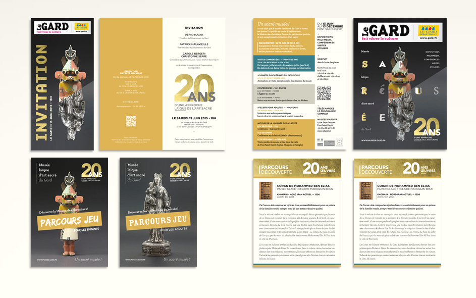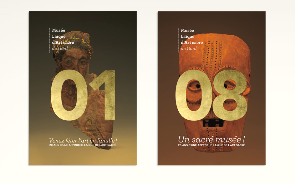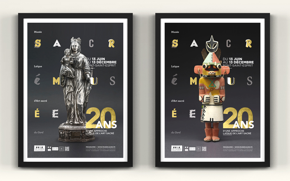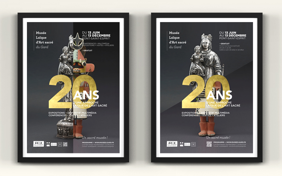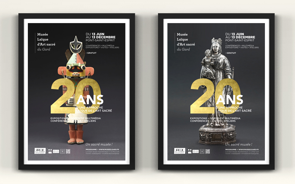 Situé à Pont-Saint-Esprit, le musée d’art sacré du Gard célèbre ses 20 ans. Logé dans une somptueuse demeure médiévale, classée monument historique, le musée d’art sacré propose une approche laïque et originale du fait religieux. Pour célébrer cet anniversaire, expositions, nouveau dispositif numérique, visites, ateliers et conférences sont proposés au public. Autant d’occasions de (re)découvrir ce lieu inattendu, fleuron du patrimoine architectural gardois et sa collection de haut niveau ! Moment charnière s’il en est, cet anniversaire des 20 ans fut l’occasion pour nous, en collaboration étroite avec la direction, de poser les bases de la future identité et de la communication du musée, tout autant que de travailler à tous les éléments de scénographie et de médiation online et offline. Photographies : M. Daspet et JL. Maby.