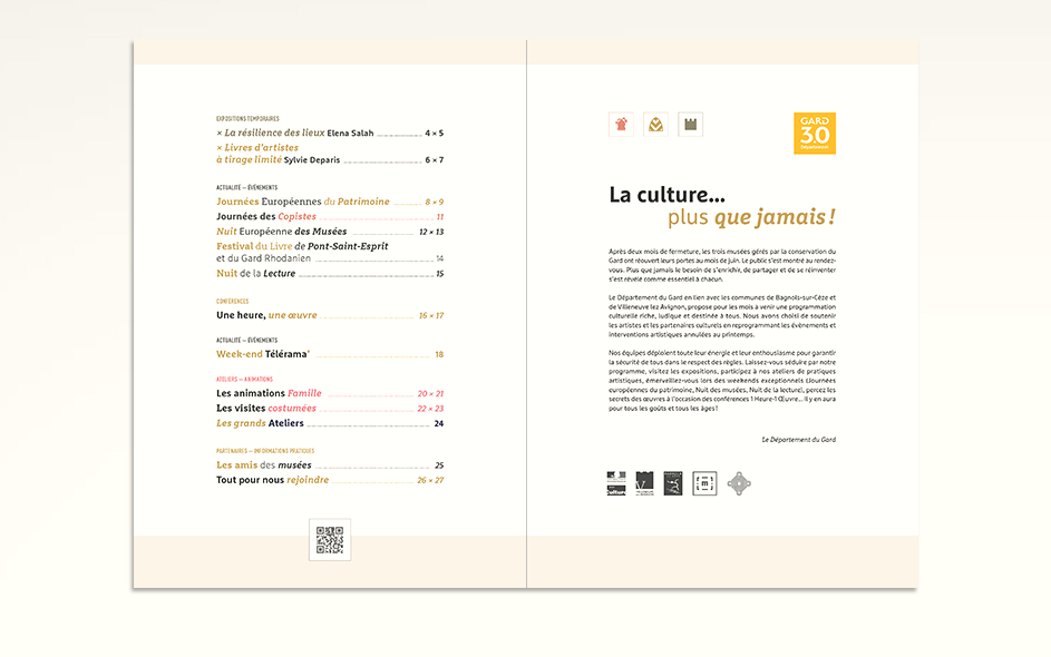 Jusqu’en 2022, la programmation culturelle de la conservation des musées du Gard était très riche et diversifiée. La conservation c’était un musée départemental situé à Pont-Saint-Esprit, deux musées à Bagnols-sur-Cèze et un musée à Villeneuve-les-Avignon. Chaque année, 4 à 6 expositions temporaires, des événements nationaux (journées du patrimoine, nuits des musées, nuits de la lecture, …), des ateliers, des conférences toutes les semaines, un cycle en biennale, des jeux et activités découvertes pour les enfants de tous âges, des visites thématiques, des coopérations diverses… La conservation ne disposait jusque là d’aucun support transversal permettant d’avoir une vue globale sur la totalité de sa programmation. Cette nouvelle brochure semestrielle, véritable outil de développement du territoire, aura le mérite de mettre en avant le travail des équipes du département autant que d’attirer encore plus de visiteurs tout en fidélisant les habitués.