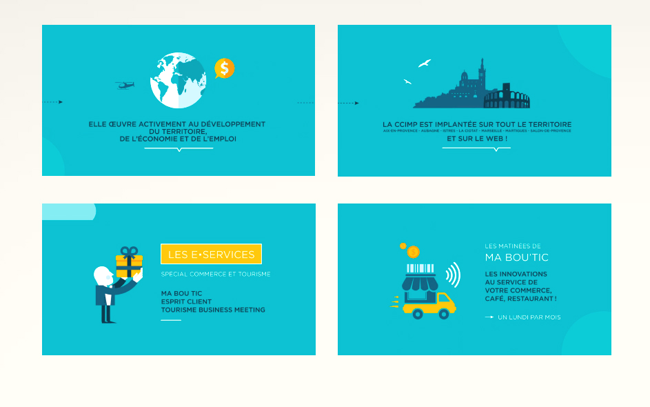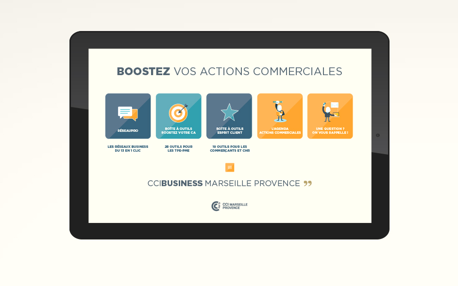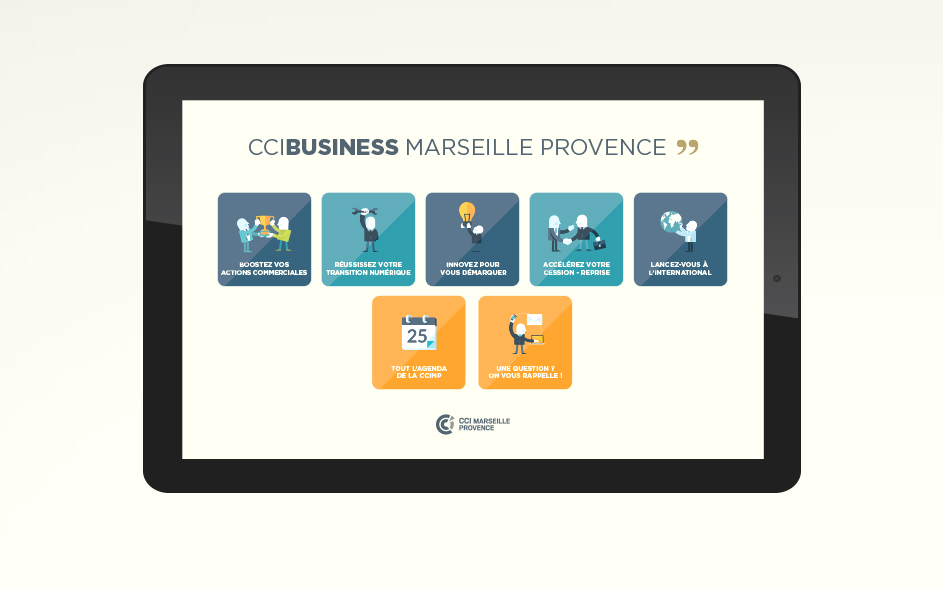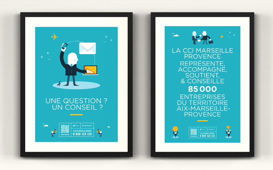 A l’occasion de « La Foire de Marseille » et ensuite du « Salon des Entrepreneurs Marseille Provence » la CCI Marseille Provence a souhaité mettre en avant son investissement dans la numérisation et la création de nouveaux services en lignes aux entreprises du territoire. Nous avons créé un série d’affiches et une webapp centralisant tous les services. Ciblé pour une audience large, la campagne se veut didactique et se déploie autour d’un personnage d’entrepreneur bonhomme avec pour volonté de faciliter l’utilisation de l’outil. Ce dispositif est aujourd’hui généralisé à tous les points d’accueil sous la nouvelle bannière « CCI Business » et un outil de gestion en permet la customisation en fonction des thématiques à mettre en avant.