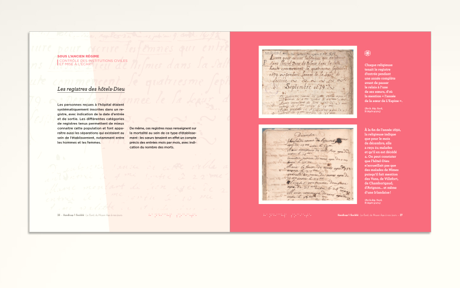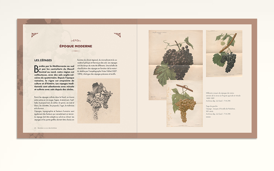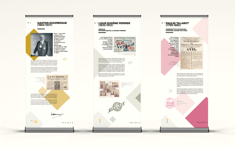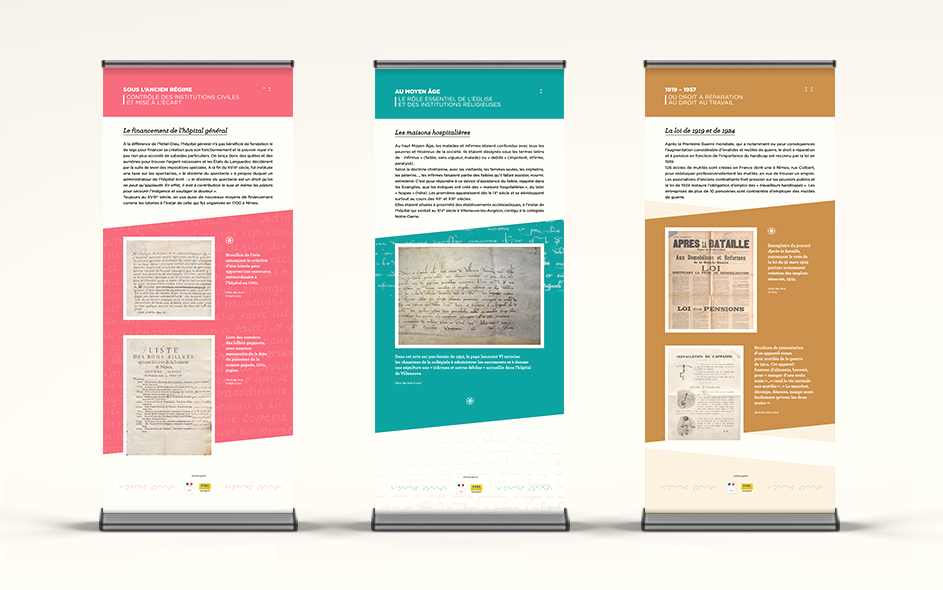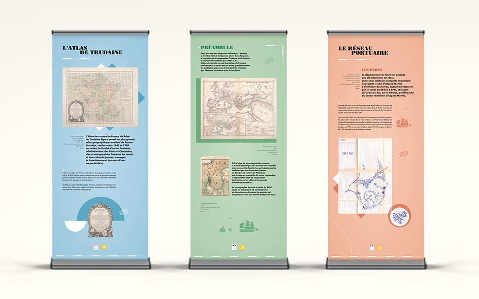 Les Archives départementales du Gard mettent en place de petites expositions documentaires itinérantes sur la base de leur fonds. L’ensemble signalétique sous forme de banners est aussi reproduit sur de petits catalogues gratuits. Les thématiques sont nombreuses et toujours finement choisies pour une vulgarisation d’intérêt pour le grand public et les jeunes gardois. L’histoire de la viticulture avec Bacchus au pays des Archives, Figures gardoises pour découvrir ces gardois qui ont fait le monde au-delà du territoire, Handicap et sociétés, Cartes et territoires ou encore Parcs et jardins du Gard…