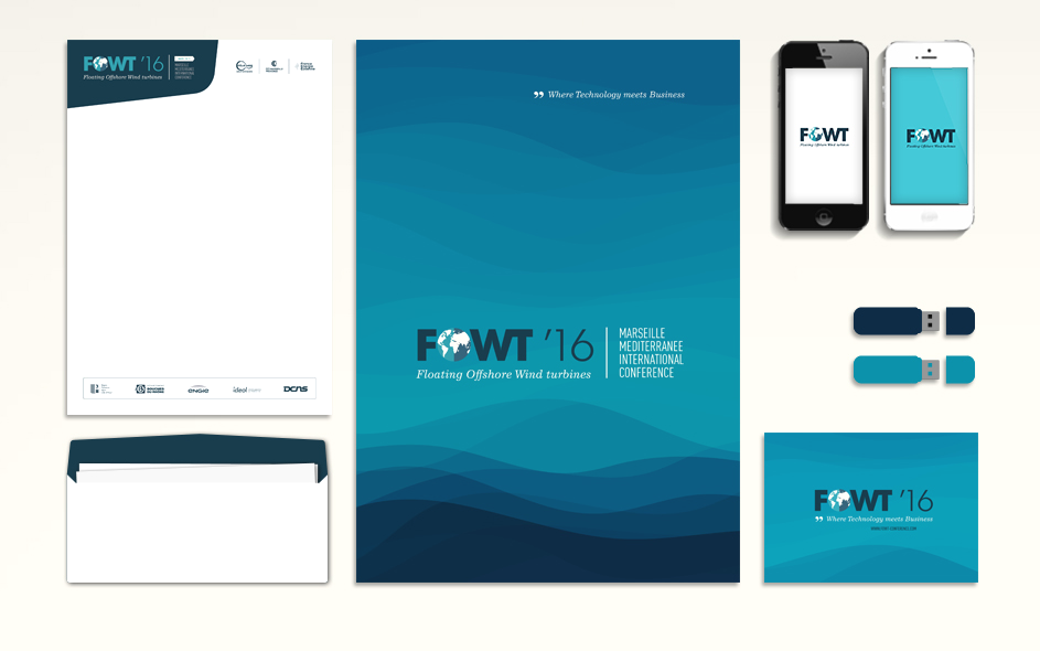 Le Pôle Mer Méditerranée et la CCIMP ont décidé de participer à leurs niveaux à l’émergence en région de l’Eolien Offshore Flottant, filière et spécialisation d’avenir. Pour leur 3e édition de la « Marseille Méditerranée International Conference on Floating Offshore Wind Turbines » ils désiraient se doter d’une ligne graphique afin de renforcer leur communication. Leurs cibles : les laboratoires spécialisés ; les PME/PMI, ETI et start-up innovantes ; les grandes entreprises participant déjà à un ou plusieurs projets pilotes. Les objectifs : renforcer l’idée d’expertise et la dimension internationale de l’événement. Nous avons décidé de simplifier l’acronyme, sa définition, son explication ; d’y apposer une baseline claire sur les objectifs. Nous sommes volontairement sortis de l’imagerie « éolienne » pour travailler dans un univers d’ondes bleues.